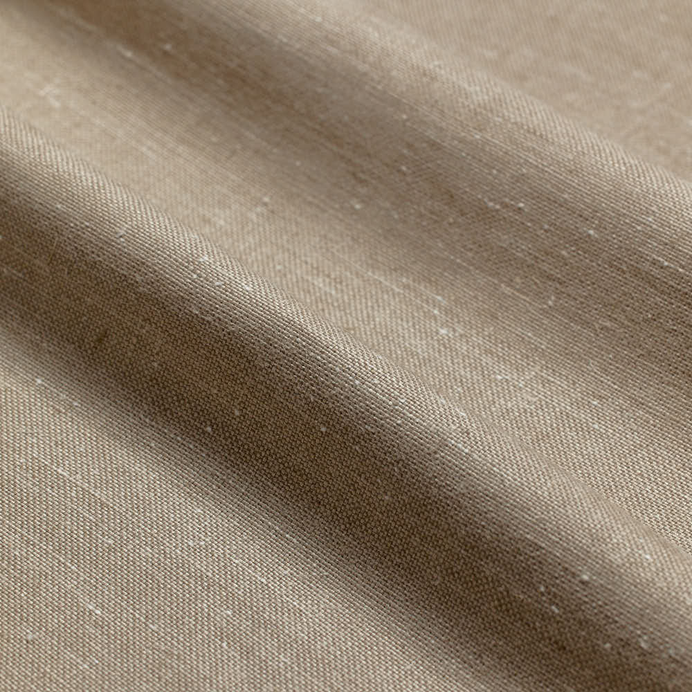 Osvaldo is a linen textile with a soft, fluid hand and a gently textured surface marked by subtle natural irregularities. Woven primarily from European linen with a touch of silk, the fabric combines a relaxed drape with a refined, almost silky feel. Fine variations in the weave add depth and character, allowing the material to appear rich and nuanced without the use of pattern or ornament.